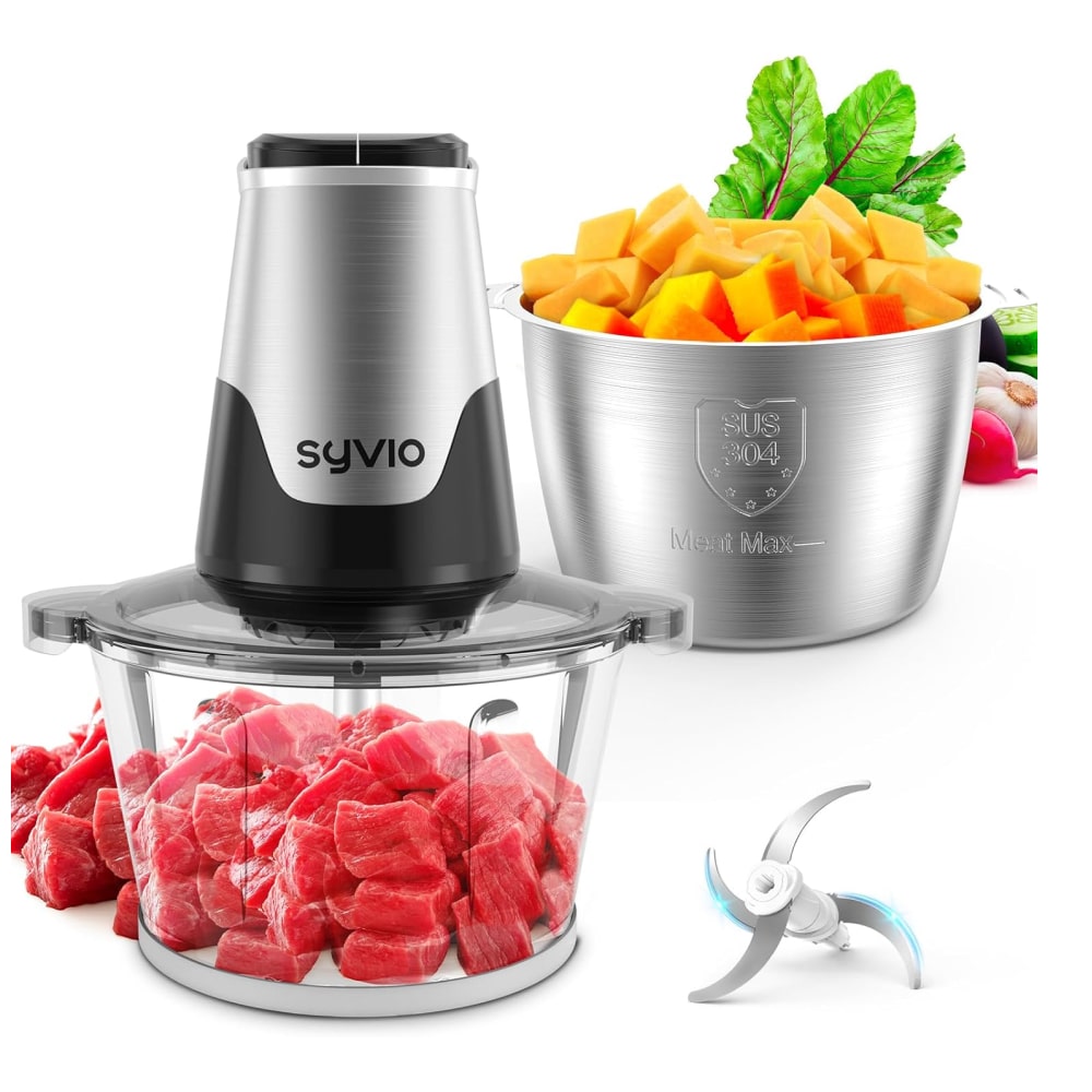 The Syvio Food Processor attempts to combine multiple kitchen functions into one unit, serving as both a meat grinder and food processor with an 8-cup glass bowl and separate stainless steel bowl. This 400W unit features four bi-level blades that chop, blend, puree, mix, and mince various ingredients with pulse control functionality.